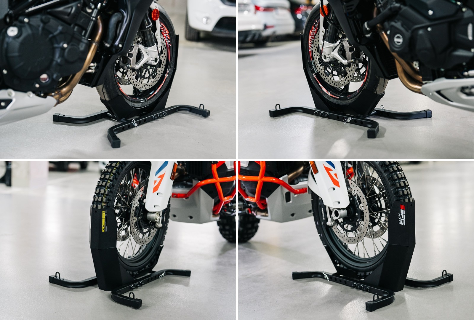 Der Transportständer C21 ist vollständig verstellbar und Sie können damit die meisten Motorräder und Motorroller transportieren oder abstellen. Dadurch eignet es sich für den Transport der meisten Motorradtypen. Um die Radgröße zu ändern, muss die Ständerhalterung einfach abgeschraubt, verschoben und wieder angeschraubt werden.