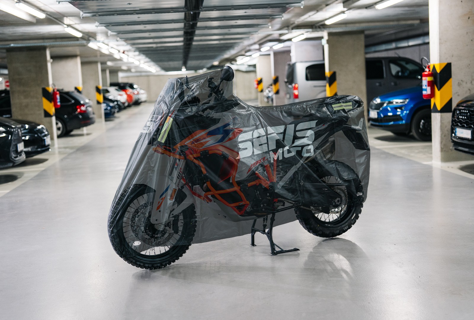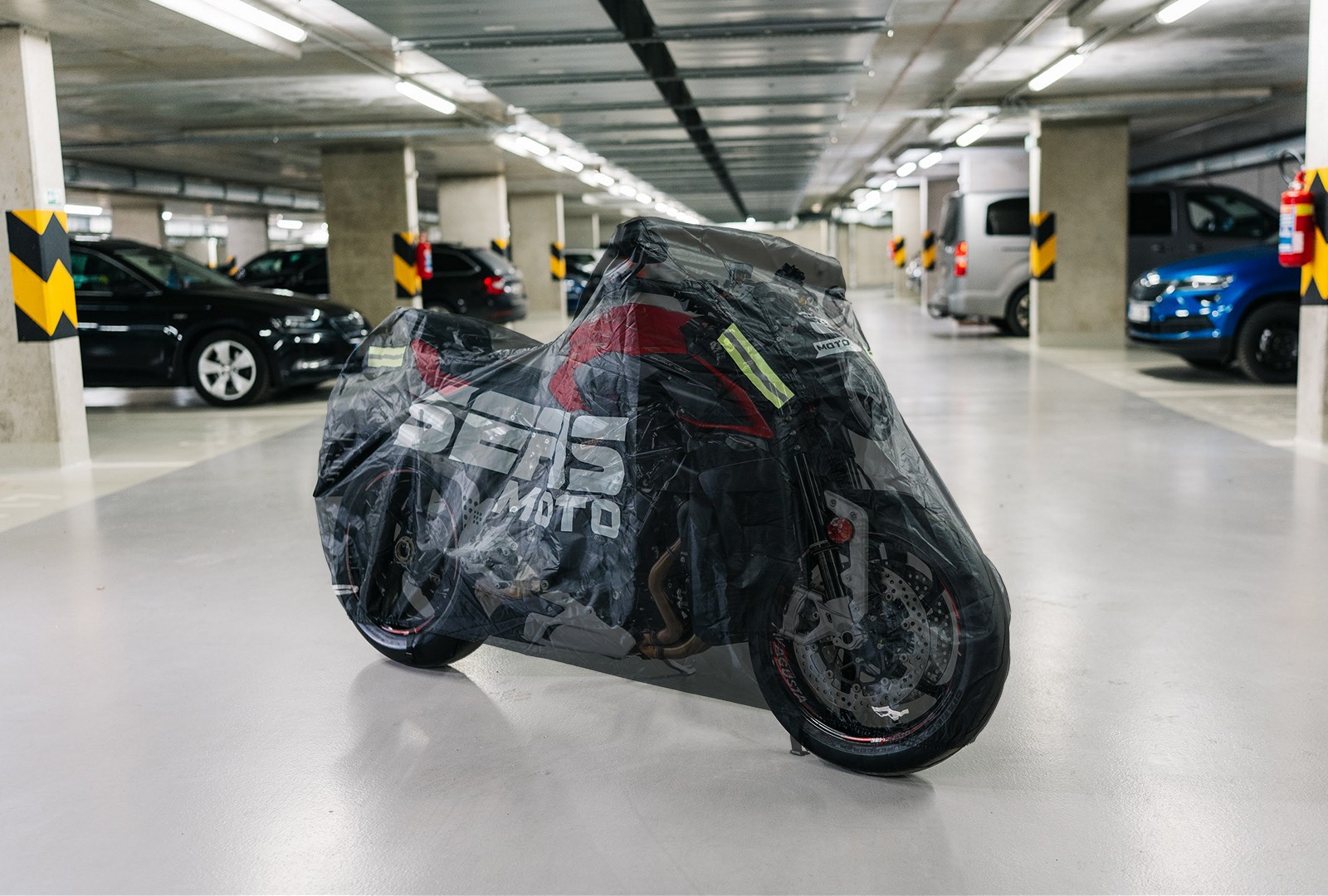 • Reflektierende Elemente vorne und hinten, damit das Motorrad unter der Plane nachts, in Tiefgaragen usw. gut sichtbar ist