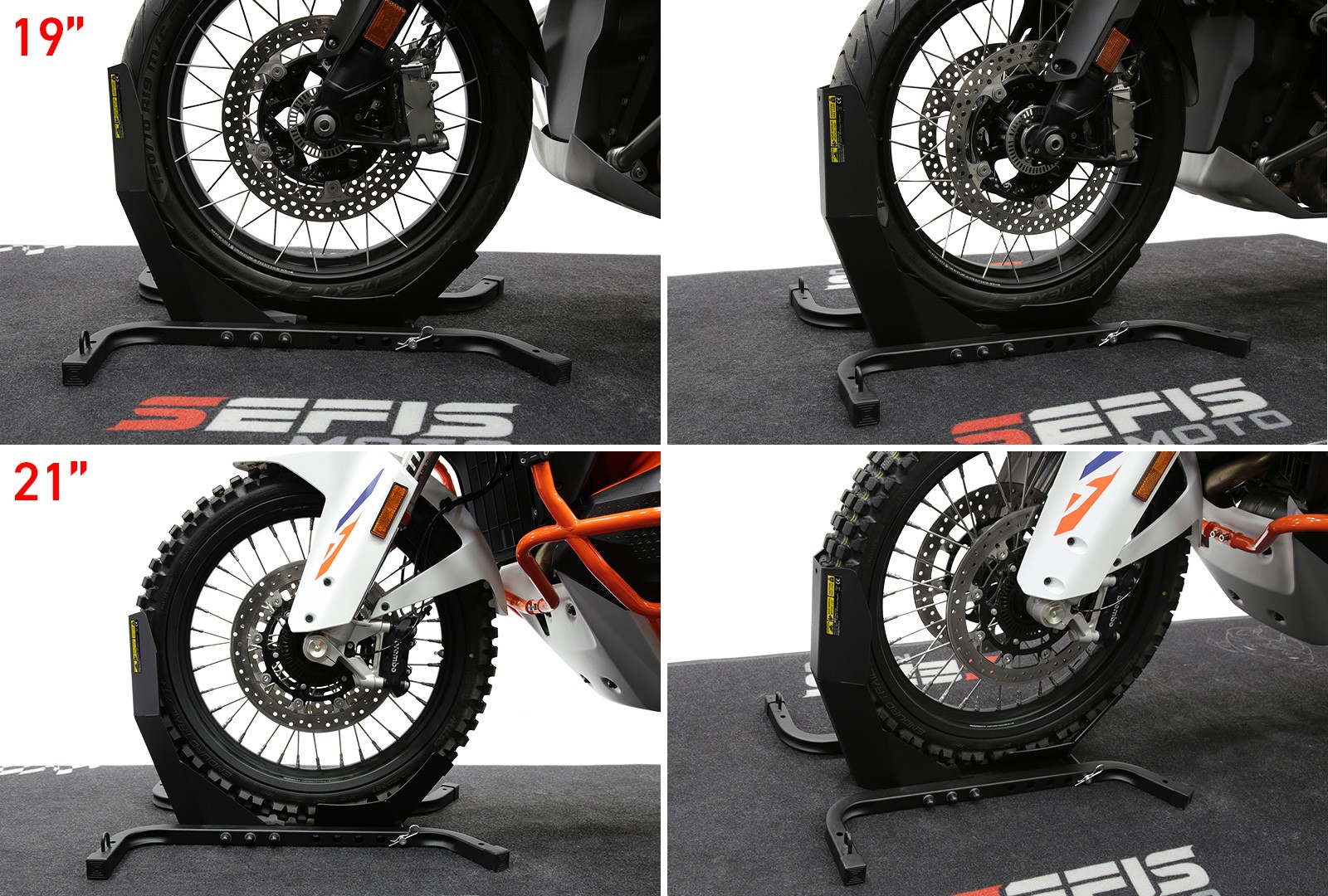 Der Transportständer C21 ist vollständig verstellbar und Sie können damit die meisten Motorräder und Motorroller transportieren oder abstellen. Dadurch eignet es sich für den Transport der meisten Motorradtypen. Um die Radgröße zu ändern, muss die Ständerhalterung einfach abgeschraubt, verschoben und wieder angeschraubt werden.