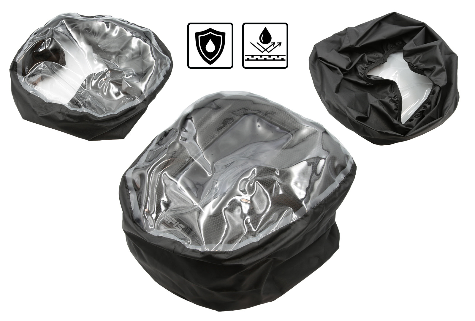 Díky své pevnosti brašna sama od sebe dokáže odolat menšímu deštíku, ale pro opravdové průtrže mračen vše uvnitř spolehlivě v suchu uchrání praktická pláštěnka s průhlednou vrchní částí. Padne přesně na brašnu a spolehlivě ji neodnese žádný poryv větru.